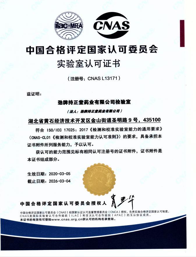 日前,劲牌持正堂药业检验室获得由中国合格评定委员会(英文简称“cnas”)授予的实验室认可证书。这是继2008年劲牌公司检测中心首次通过国家cnas认可(食品领域)以来,劲牌再次通过国家cnas认可(药品领域)。